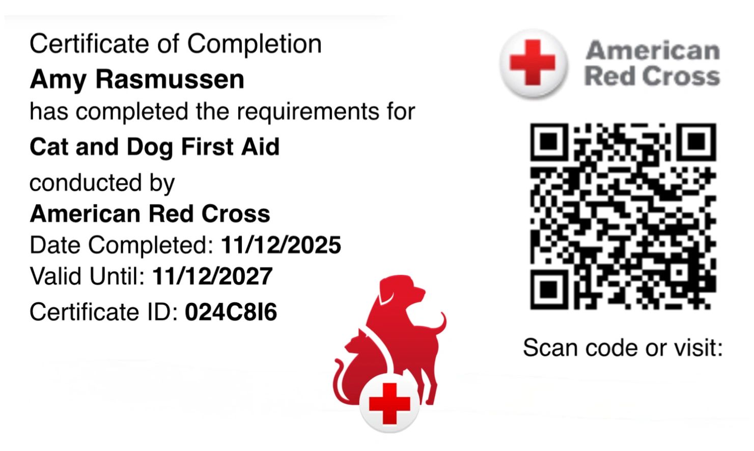 In person & online certification which equips me to handle emergencies. My dedication to ensuring the safety and well-being of animals in my care. Prompt response to medical emergencies mitigates the severity of injuries, reduces potential complications & provides peace of mind knowing I’m prepared for any situation.